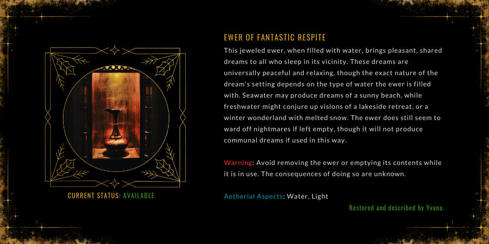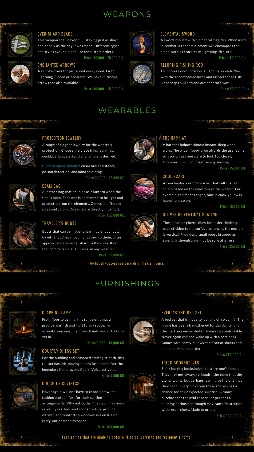 | Furniture Pieces | Custom pieces with or without enchantments. | Naja★, Doku, Harli |