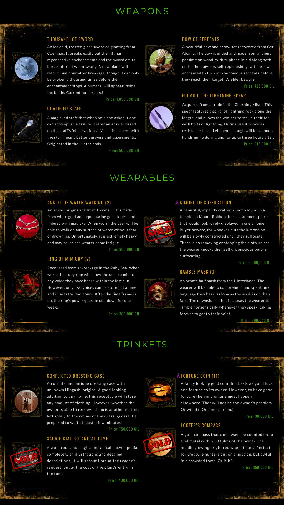 | Enchantments | Providing magical boosts and or effects to items, fabrics, weapons, etc. | Doku★, Harli |