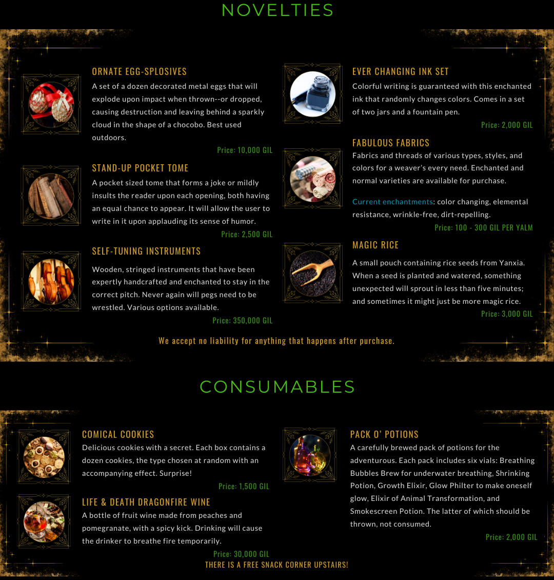 Welcome to Poison & Flame, a relics and curios shop where we strive to provide interesting items to curious individuals. Feel free to browse and/or relax! Complimentary snacks are upstairs; tea and coffee, sandwiches, and cookies are available (enchantment free).The premises also doubles as Doku and Naja's home, so please be kind. Any thievery inside the shop will only result in the item being returned from whence it came and a shock to the hands, due to the anti-theft wards and enchantments.